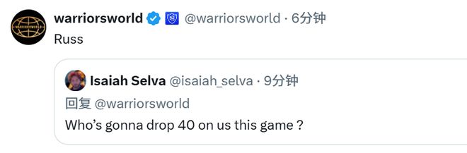 缺少两大球星的国王,或许会更加依赖威少的发挥。上一场比赛对阵掘金,威少轰下26分12篮板6助攻,得分和篮板均创赛季新高。本场比赛,他的出场时间预计也不会少,或许又是一次放开抡的机会。有意思的是一位球迷向勇士媒体warriorsworld提问:“谁会在这场比赛中对阵我们轰下40分?”warriorsworld的回答正是“Russ(威少)”。